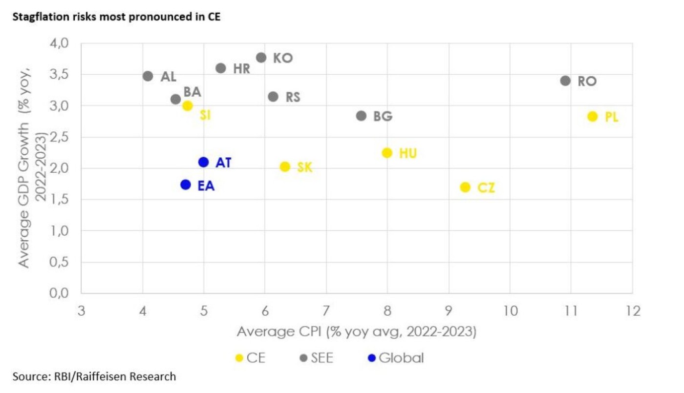 Stagflation – an economic environment with sustained rising or above-average inflation rates and either no or marginal real growth in the production of goods and services– is generally considered to be the worst of both worlds in economics, and thus a scenario that is strongly feared. Since its last occurrence in the 1970’s such a scenario usually seemed far away but given the sequential supply shocks of the pandemic and the war in Ukraine, stagflation has now come too close for comfort. Still, stagflation risks are diverging between CE and SEE countries, with South-eastern Europe much less at risk. On the one hand due to the more optimistic inflation dynamics, on the other due to a more optimistic growth outlook. As the strongest impact on growth arising from the war in Ukraine takes place in the industrial sector, growth in the industry-focused Central European countries and Romania is likely to show the strongest slowdown. Whereas the relatively more services oriented SEE countries will be less strongly affected. Q2 2022 will likely be better than the rest of the year, given the still ongoing recovery from the pandemic. Going forward, however, the disruptions to industry stemming from the bottlenecks in (energy) supplies will likely slow growth, especially in the winter of 22-23 (with Poland possibly on the stronger side due to higher diversification of industry, Hungary most vulnerable to energy supply disruptions from Russia and Czechia most integrated and correlated with euro area developments). The reduction of real household disposable incomes, affected both by inflation and the restrictive monetary policy/rising rates, should diminish consumption and thereby growth. The inflow of NGEU funds and possible nearshoring (from diversification of supply chains) will support investments, despite the industrial weakness, and buoy the growth from 2023 onwards. The direct impact on GDP growth in Southeastern European economies is even less pronounced than in CE and the euro area, as most countries (except Bulgaria) have limited economic linkages with Russia and lower dependency on Russian energy imports. For most countries, the strongest (additional) impact will come from a decrease in private consumption, mainly caused by the even higher inflation, but also due to lower growth in the euro area and possibly smaller flows of remittances. However, some countries in the region, those not benefitting from the NGEU funds, might see a reduction in private investments, which are pressured by the high uncertainty.